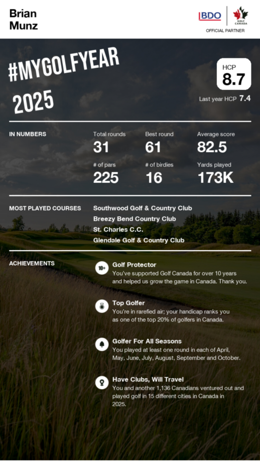 Golf Canada members can now relive their 2025 golf season with #MyGolfYear, the annual personalized recap of rounds played, milestones and achievements, presented by BDO.